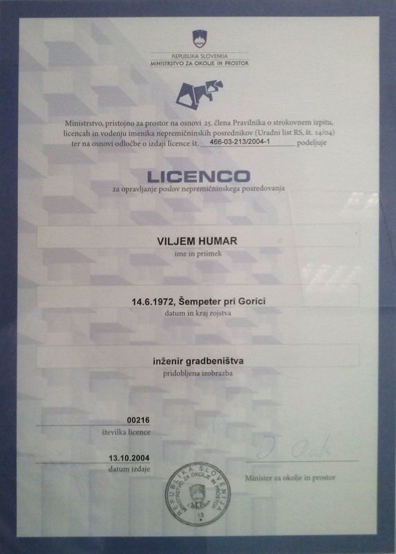 Licenco za posredovanje nepremičnin ki je vpisan v imenik Ministrstvo za okolje in prostor pod zaporedno štev.;00216.